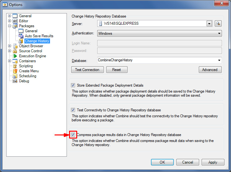 To instruct Combine to write both general package info and detailed database changes, users should go to Tools → Option → Packages → Change History. First, users must enter the location of the Change History Repository database and provide the credentials that will be used to connect and use (i.e., read from or write to) the repository. Then, users should check the checkbox Store Extended Package Deployment Details and click the Apply button in the Options dialog.