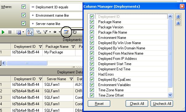 The Change History tool consists of two grids: The upper grid contains general package deployment information (i.e., one row for each package executed), whereas the lower grid displays detailed database change information (i.e., one row for each script and target database that were executed during the deployment of a code package). Each grids contain many different columns (see the Overview section for detailed column description) and the Change History tool provide simple means that enable users to hide or organize columns in accordance with user preferences.