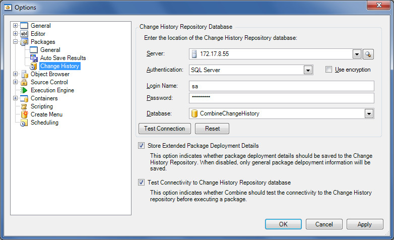 After installing a Change History Repository database, all users and machines that wish to write to the repository and track package deployment results, should configure Combine with the location and credentials of the repository. Specifically, each user should go to Tools → Options → Packages → Change History, and provide the connection information for the SQL Server and database that hold the repository (see image below).