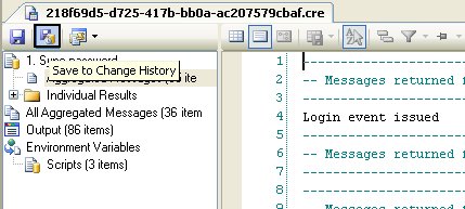 4. A new window that displays the package results is now opened in the editor. In this window, refer to the top left hand side and click the option Save to Change History (see the section titled Populating the Change History Repository from a Cre File for more information).