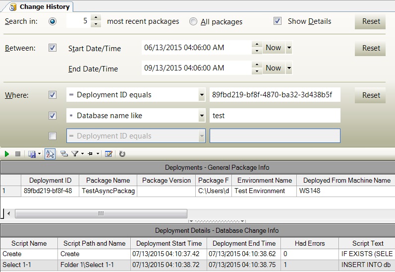 2. When using the Change History tool to view past deployment results, users can search the repository to find exact deployment details (e.g., all scripts that were deployed on a certain database, scripts that were executed using a certain SQL login, and so on). However, if you choose only store the general deployment then searches by the next criteria on compressed package data will be impossible: