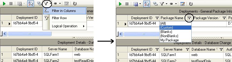 2. After the complete set of data is displayed in the Change History grids, select the Filter button in the grid (see image below) and set column filters in the grid to search for specific entries. Searched columns and search conditions can be specified either at the top grid (General Package Info), the bottom grid (Detailed DB Change Info), or both.