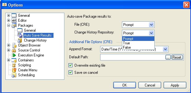 Related Topics. Combine can also be configured to prompt and ask users whether deployment results should be written to the repository before a package is executed. Alternatively, users can instruct Combine to always write the deployment results. To set these options, go to Tools → Options → Packages → Auto Save Results and select the desired option from the drop-down menu next to the Change History Repository entry (see image below). If you select Prompt, then Combine will prompt and ask you whether you wish to store deployment results in the repository before a package is executed. On the other hand, you can set this option to True to always store the deployment results. The last option (i.e., False) allows you to choose to not be prompted and not store any execution results to the repository.