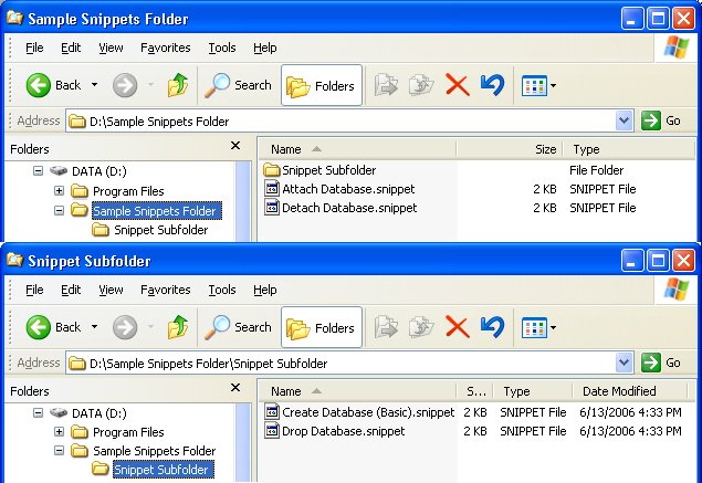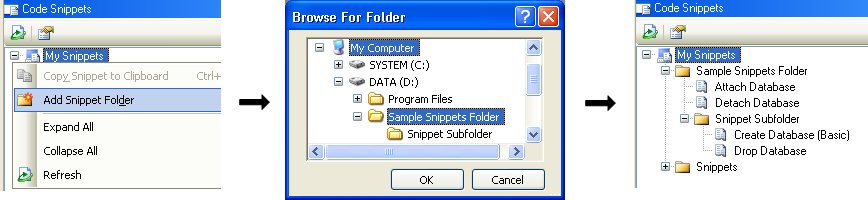 To demonstrate the addition of a new folder, please refer to the example below: The folder named “Sample Snippets Folder” contains two code snippets and a subfolder named “Snippet Subfolder” that also has two snippet files. To add the folder “Sample Snippets Folder” (and the subfolder and all code snippets), go to the Code Snippets window, right-click the “My Snippets” node in the snippets tree, and select Add Snippet Folder. Then, in the dialog titled Browse for Folder, select “Sample Snippets Folder” and press OK. The folder, subfolder, and all code snippets will be loaded to the Code Snippets window, as illustrated in the figure below.