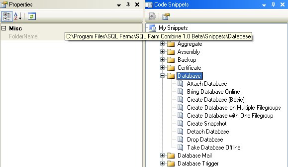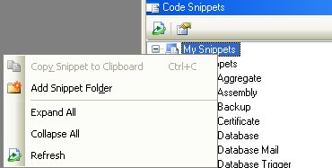 Combine contains many built-in SQL and T-SQL code templates (also known as snippets). These snippets are provided in order to simplify the code-writing process of common tasks and procedures, such as table creation, database backups, addition of users and roles, and other popular actions. Furthermore, Combine allows users to customize the code snippets interface: create new code snippets, add new snippets to the interface, add snippet folders, as well as share snippets with other users.