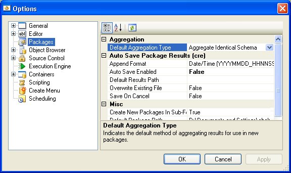 The data aggregation mode can be specified in numerous locations throughout the application, depending on the user needs. To set the default aggregation type, both for code packages and SQL scripts or queries that are executed in the editor, go to Tools → Options → Packages → Aggregation, and set the property Default Aggregation Type (see Fig. 102.19). By default, this value is set to Aggregate Identical Schema.
