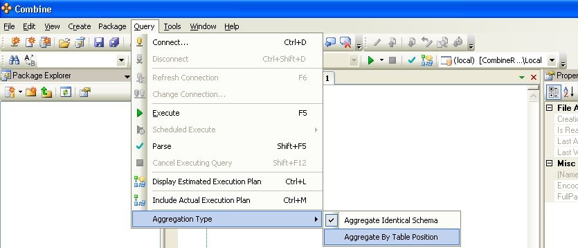 Aggregate by table position: With this aggregation mode, all the (say) N-th result sets returned from all databases are aggregated into a single result set, regardless of whether the column schema is identical for all results. For example, if a script contains 2 queries and the first query returns 9 result sets from 9 databases with 3 different column schemas then Combine will provide a single aggregated result set with data from all 9 databases in response to the first query in the script.