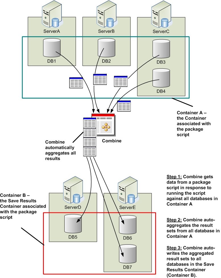 If a script inside a code package contains one or more SELECT statements, when the package is executed, the script will run against all the databases in the Container associated with this script. The results returned from all the target databases will be automatically aggregated by Combine. If you wish to write the aggregated results to one or more databases, you can do so by setting the Save Script Result properties that are associated with the script. Keep in mind that you will also have to configure all the result-saving options to make sure that Combine writes the results to the appropriate databases and tables.