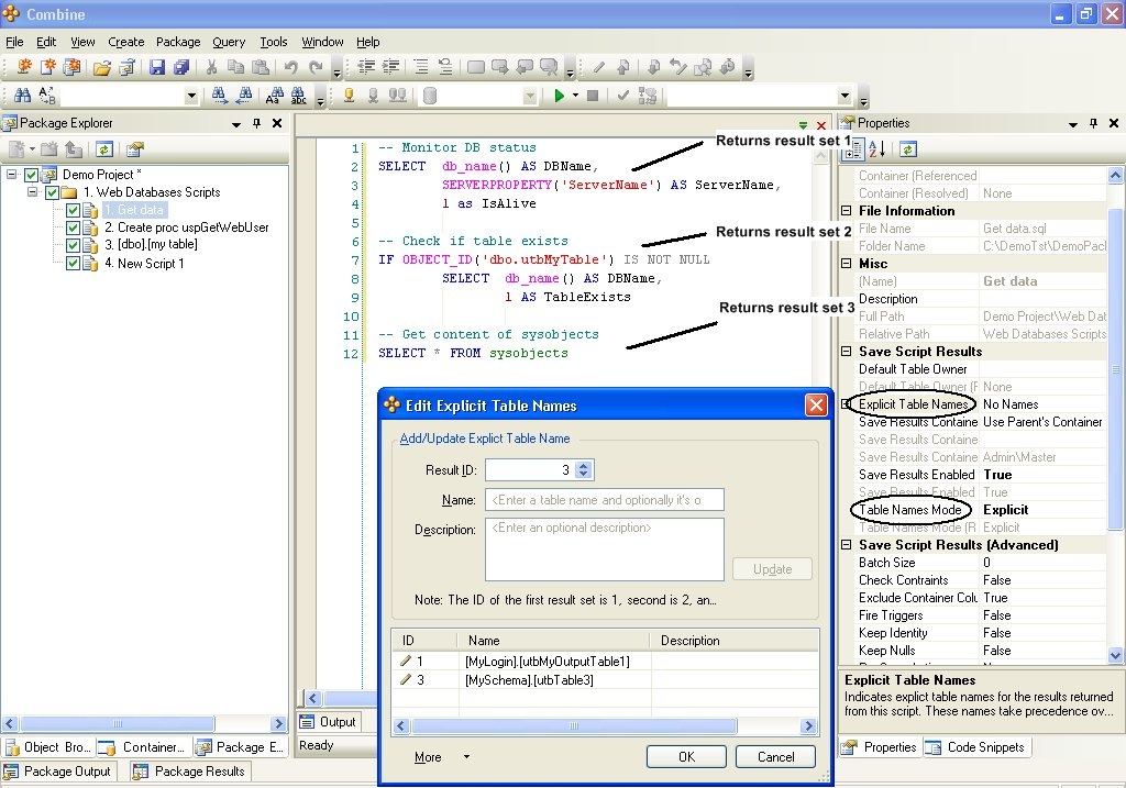 Explicit Table Names – In this mode you can accurately specify the table name for each aggregated result set returned for the script. For example, assume that a script returns 3 aggregated result sets in response to three different SELECT statements. Using Explicit Table Names you can tell Combine to use (say) a table called [MyLogin].[utbMyOutputTable1] for the first result set (i.e., the one with Result ID = 1), skip the saving of the second result set (by not specifying a table name for Result ID = 2), and save the third set of aggregated results to a table called [MySchema].[utbTable3] by assigning this explicit table name to Result ID = 3. This example is demonstrated in the image below. To use Explicit table names, set the Table Names Mode property to Explicit, click the property Explicit Table Names, and set the table names and their corresponding Result ID values in the dialog.
