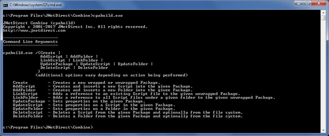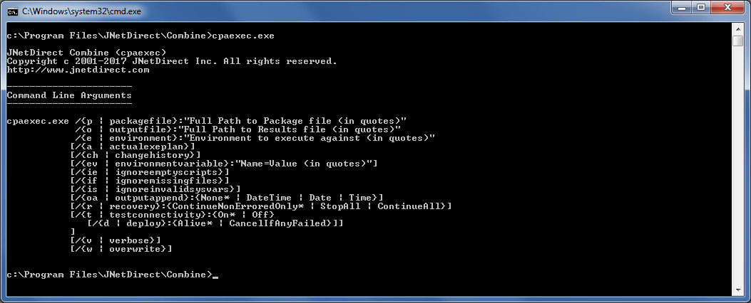 Combine allows you to deploy code packages from the command line using the cpaexec.exe command line utility. All features and options that are available in the Combine user-interface are also included in this utility. The cpaexec.exe utility is available in the Combine installation directory. To bring up the menu in the image below, change the directory to the Combine installation directory in the command prompt, type “cpaexec” and hit Enter.