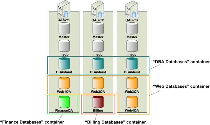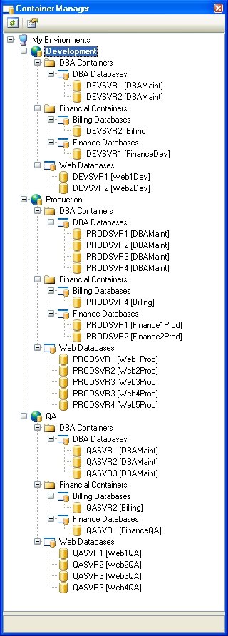 A Container is a group of one or more databases, either on the same server or on different servers. Each database in the group is identified by the database name and its SQL server instance name (or IP address). A single database can belong to several Containers. In other words, a database that belongs to one Container can belong to other Containers as well.