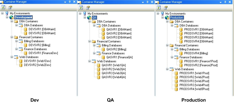 As stated earlier, it is sufficient for developers to maintain the Dev Containers, for QA engineers to maintain the Containers that belong to the QA Environment, and for DBAs to keep the Production Environment Container settings. In this case, the following figure shows the Container Manager viewed by developers, QA engineers, and DBAs, respectively, when all the Containers are Static Containers. Keep in mind that Containers in different Environments need not be of the same type – Static Containers in one Environment could correspond to Dynamic Containers in another Environment as long as they have the same Container name (and they are placed under folders with same names in the Container Manager).