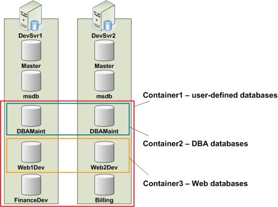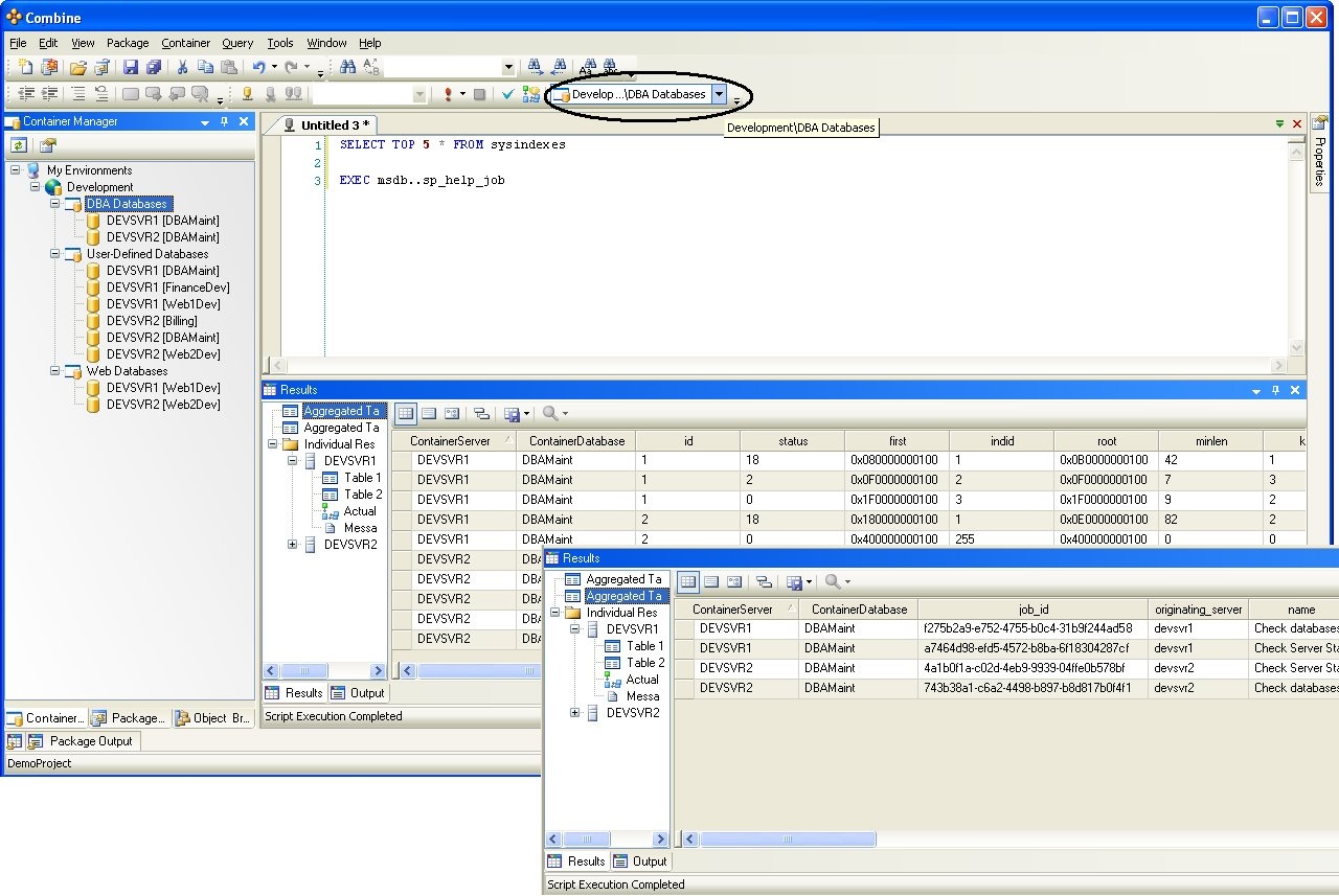 As an example, consider the following diagram that describes three different Containers: Container1 consists of all user-defined databases on the DevSvr1 and DevSvr2 servers. The target databases of Container2 are the DBA databases named DBAMaint on the two servers, and Container3 holds the set of Web databases, namely Web1Dev and Web2Dev. With these mappings, the user can now run scripts and queries against several databases in parallel. For instance, if we execute the SQL statement SELECT * FROM sysindexes against Container1, then the content of sysindexes will be returned from all six databases in the container. Similarly, running a script that creates a stored procedure against Container3 will create the stored procedure on the Web1Dev and Web2Dev databases at the same time. Additional examples are provided in the images below. By running scripts and queries against Containers, database administrators can easily collect information about indexes, jobs, and all other database objects by a click of a button (see sample code packages in our support forums).