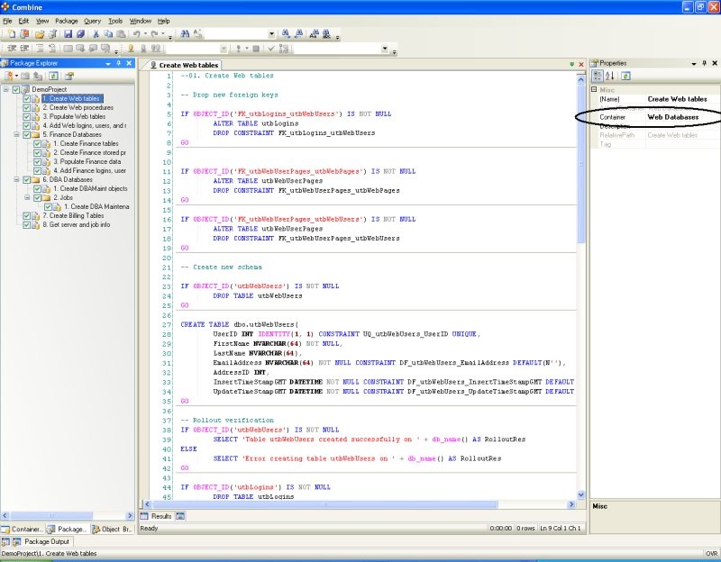 Notice that each script in the sample package of Figure 12 includes a SQL statement that verifies that changes and objects created in the script are indeed deployed successfully. For example, once a table is created the script verifies that a valid OBJECT_ID is available for the new table (i.e., OBJECT_ID(TableName) IS NOT NULL) and returns a single row to inform the user of the rollout results.