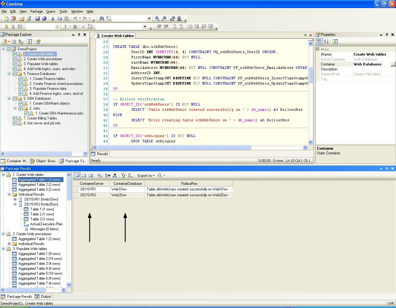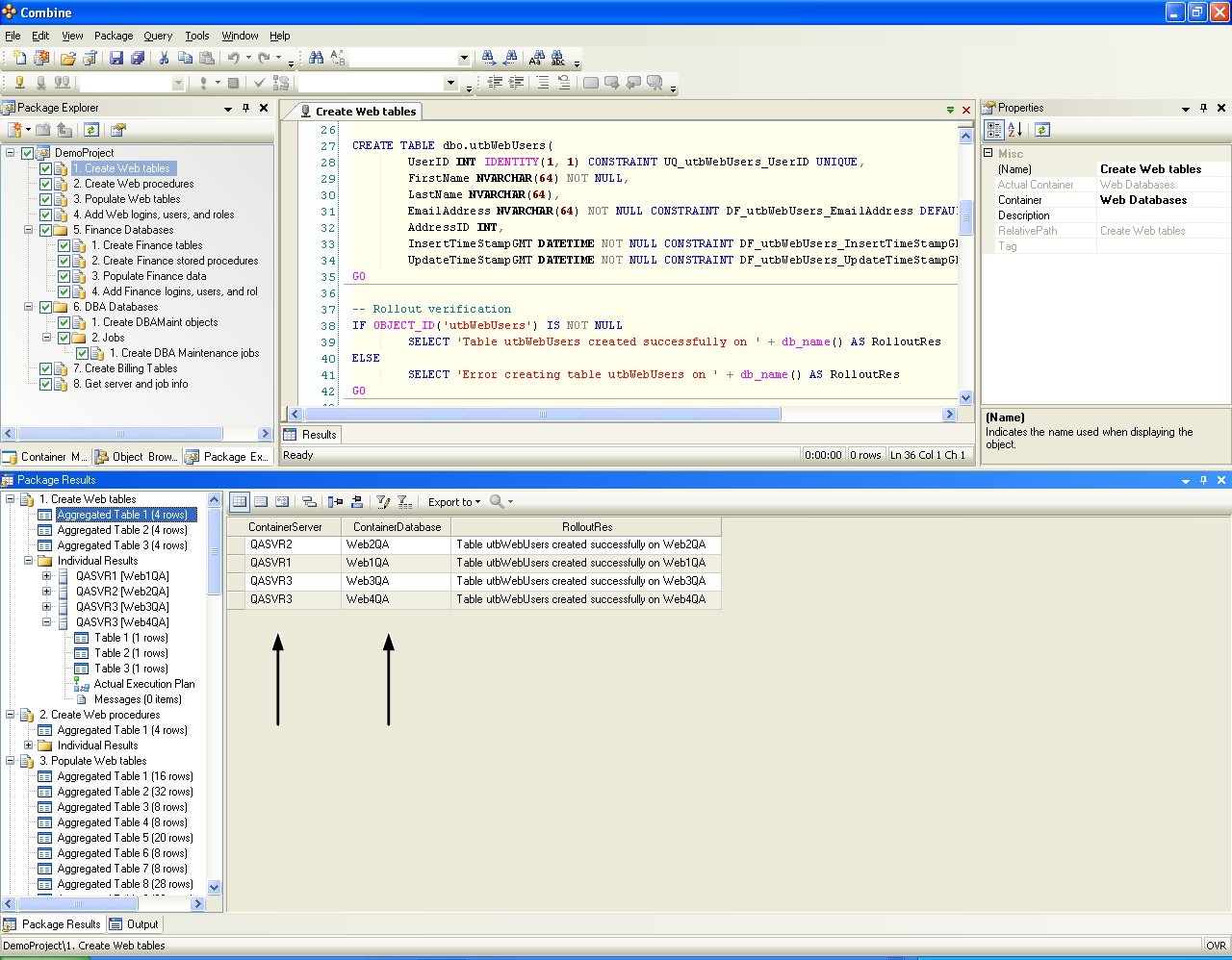 Scripts in the package are executed according to their order in the package tree (see Configuring Code Packages for complete details). When developers run the package, scripts will be deployed on databases in the Containers of the Development Environment listed in Figure 11, and the deployment results are given in Figure 13. When the package is passed to QA engineers, the package is deployed by a click of a button on all the target databases in the QA Environment shown in Figure 11 without making any modification to the package configuration or package content. Execution results in the QA Environment are presented in Figure 14. In the same manner, after the package is sent to Production, DBAs need not make any package changes and can deploy the entire package on all target databases in the Production Environment by a click of a button as shown in Figure 16 below. Notice that the ContainerServer and ContainerDatabase columns in the grids result in the images below are added automatically by Combine to reflect the target database from which each row in the grid is returned). Results returned from the package execution are displayed as aggregated results from all target databases and also include the execution plan and results for each individual database.