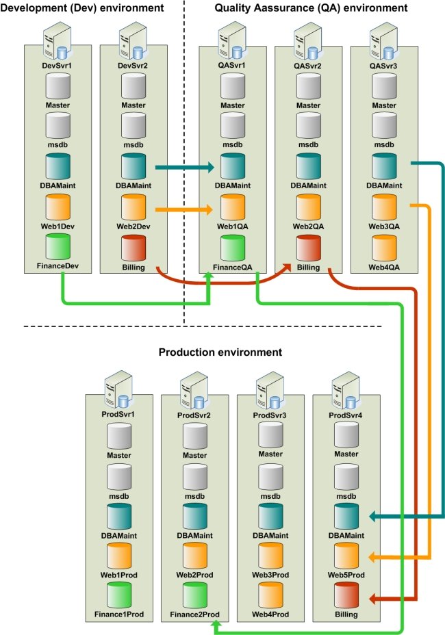 The Production environment – Releases that pass all quality assurance tests are forwarded to production for final deployment. Here, assume that there are four SQL servers: ProdSvr1, ProdSvr2, ProdSvr3, and ProdSvr4 (see Figure 8). In production, scripts developed for the Billing database are deployed on the Billing database on the ProdSvr4 server; scripts written for the FinanceDev database are now executed on the Finance1Prod and Finance2Prod databases, whereas all Web scripts are now run on five production databases, namely Web1Prod, Web2Prod, Web3Prod, Web4Prod, and Web5Prod. The same idea is followed by the DBAMaint databases.