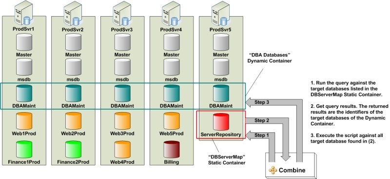 Dynamic Containers assume that a list of servers and databases is already available in some tables. Throughout, we use the term Repository, or Reference, to denote the database in which the server-to-database mappings reside. When a script is run against a Dynamic Container, Combine first connects to the Reference database and runs a user-provided query that returns the identifiers of all target databases. Then, as in the case of Static Containers, Combine connects and deploys the script on all target databases.