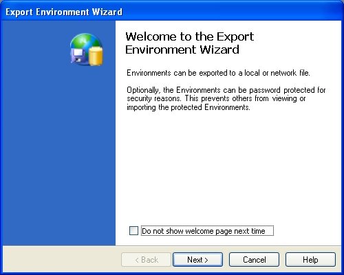 To export your Environments click any item in the Container Manager and select Container → Export from the main menu. The first welcome page of the Export Environment Wizard will then be displayed. If you do not wish to see the welcome page in the future then check the “Do not show welcome page next time” checkbox and press the Next button.
