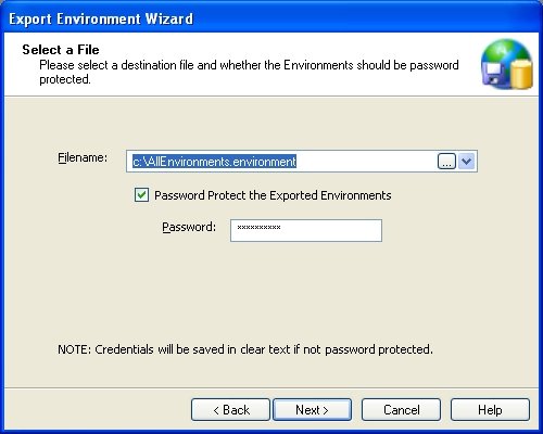 Next you must choose the output file name. The output file name will have the extension “environment”. You may also instruct Combine to encrypt the export file by using the password protection option. If you do not use password protection then SQL user names previously entered in the Container settings will be stored in clear text and could be visible to others. SQL passwords will never be displayed in clear text and will always be encrypted. When encryption and password protection is used, you must also provide a password.