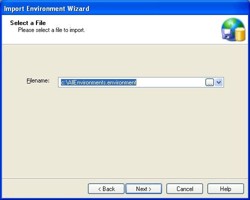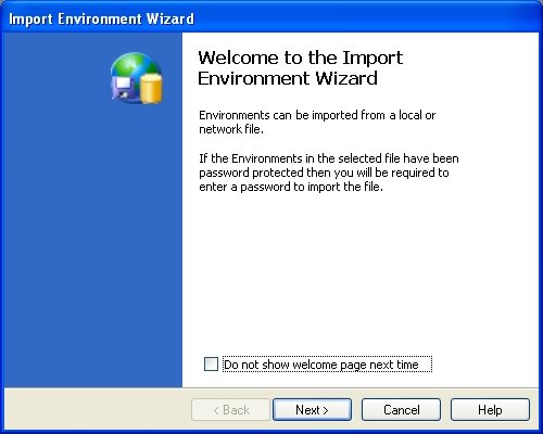Before you begin the Environment import process, first locate the file you wish to import. This file must have the extension “environment” (for example, c:\AllEnvironments.environment). If this file was exported using password-protection then you must also have the password handy. In order to start importing please select Containers → Import from the main menu to launch the Import Environment Wizard. The welcome page will appear first and you can instruct the wizard to not display this page again in the future. Press Next to advance to the next page.