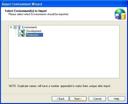 You will then be presented with the list of Environments included in the file. You do not have to import all Environments. Select the Environments you wish to import and press the Next button.