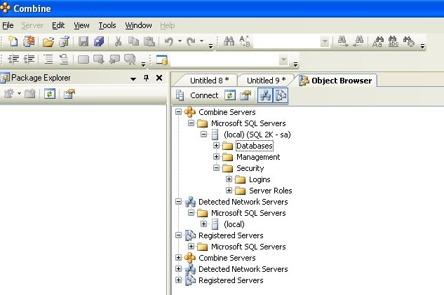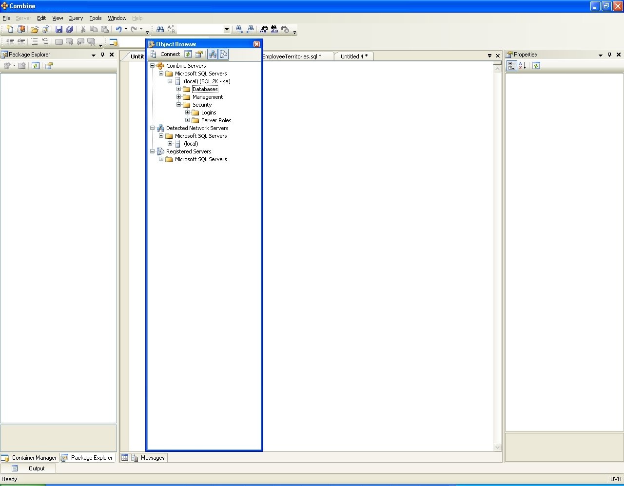 . In the first figure, the Properties window is pinned. The Object Browser, Package Explorer, and Container Manager are tabbed windows and are pinned as well.