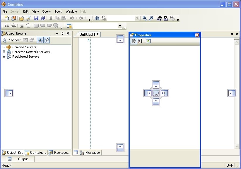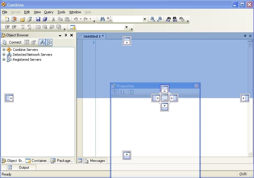 Windows can be moved throughout the interface and docked in different places. To move a window from its current location, drag the main window toolbar. Combine will then provide you with automated placement controls that will help you to place the window. For example, when you move the Properties window to the center of the interface you will receive the control images as in the figure below.