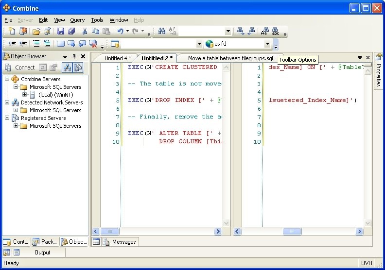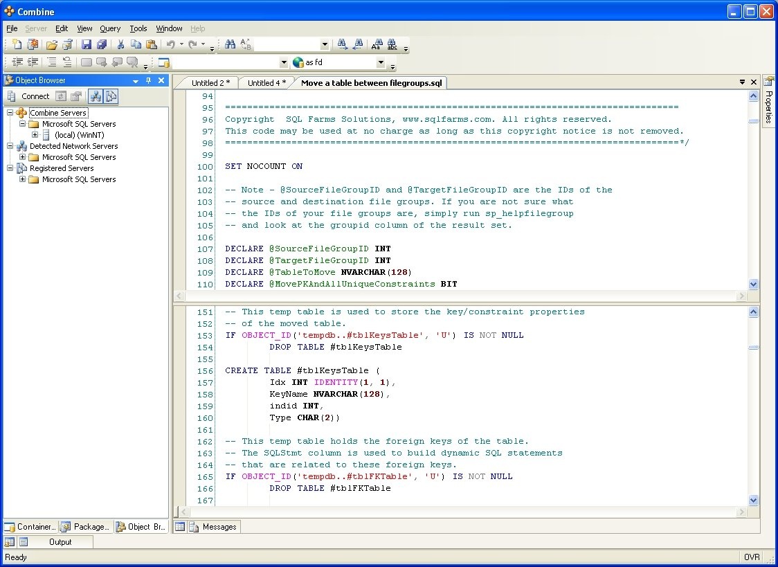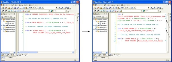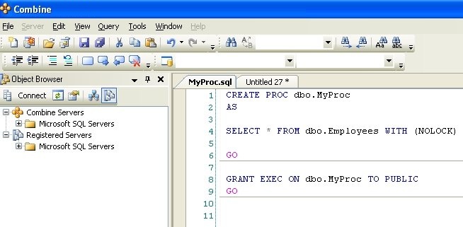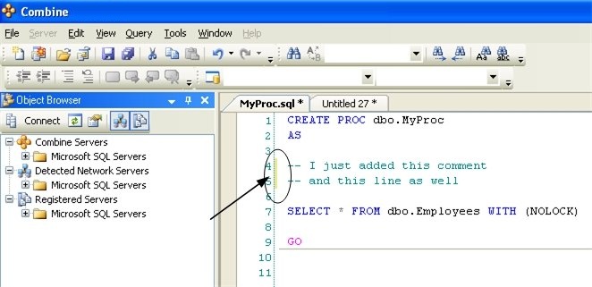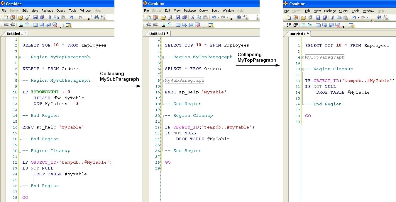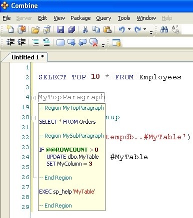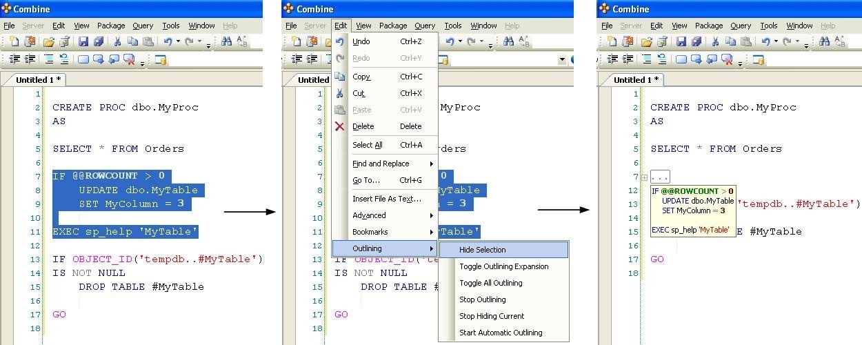 If outlined paragraphs are defined inside stored procedures, functions, or triggers, the ” — Region ParagraphName” and “— End Region” comment lines will be part of the body of the store procedure. Others using Combine can script the stored procedure from the server and will be able to use the built-in outlined paragraphs. If you do not wish to include the outlining comment lines inside your stored procedures, an additional outlining-equivalent technique is available as well. In order to use this alternative technique, first stop the automatic outlining by selecting Edit > Outlining > Stop Outlining from the main menu, and observe that the entries in the Edit > Outlining option menu have changed. Next, select one or more lines of code that you wish to turn into a collapsible paragraph in the editor and choose Edit > Outlining > Hide Selection from the main menu. Using this outlining method does not add any comment lines to the body of stored procedures, functions, or any other SQL code script.
