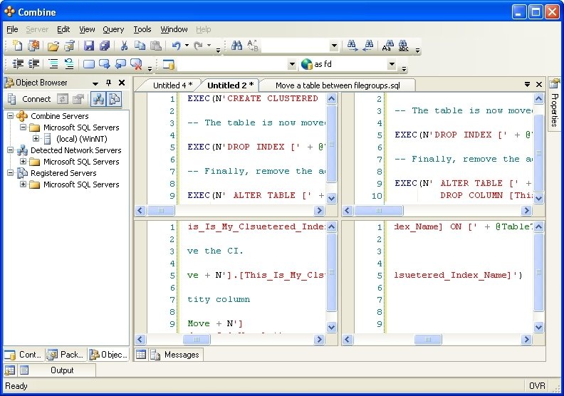 Four Way Split. The editor window can be split a single script screen into four different sections. This allows you to work on different portions of the code in four different working sections. Splitting the screen into four sections is demonstrated in the figure below.