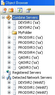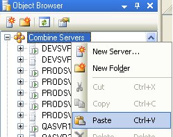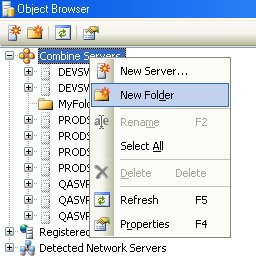 Server groups are provided to help you organize your Combine servers in any way that you see fit. Using the Object Browser, you can create groups and sub-groups of SQL servers by placing them under a folder, or dragging server nodes and dropping them under different folders. To create a new folder, right-click the Object Browser tree node under which the new folder will reside, and select New Folder. Such nodes can be either the Combine Servers root node, or an existing folder.