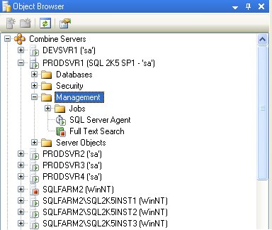 The Object Browser allows users to view the status of several SQL server services. The status of the SQL Server service is marked in the server icon as illustrated in the image below. The status of other services, such as the SQL Server Agent and the Full Text Search are available after the SQL Server node is expanded in the Object Browser, and can be found under the Management folder. Using the Object Browser users can stop, start or pause services on one or more SQL Server instances in parallel, by selecting the servers and then right-clicking and choosing the appropriate commands.