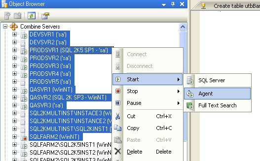 The Object Browser allows users to stop, start, or pause SQL services on one or more SQL Servers in parallel. To start SQL services, select the servers you wish to start under Combine Servers, right-click and select Start and then choose the service. When starting dependent services such as the Full Text Search or the SQL Agent, if the SQL Server service is not running then Combine will start it before starting the requested service.