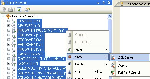 The Object Browser allows users to stop, start, or pause SQL services on one or more SQL Servers in parallel. To stop SQL services, select the servers you wish to stop under Combine Servers, right-click and select Stop and then choose the service. When stopping a service with dependencies such as the SQL Server service, if any dependent services are running then Combine will stop them before stopping the requested service.