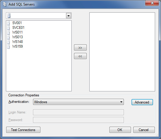 On the left side of the dialog there is a list of servers which were automatically detected on the network by Combine. You can either select one or more of those servers, or alternatively enter the server name and press the right-arrows button. If you need to specify a server port, you can enter it after the server name separating by comma. You should then enter the authentication type that will be used to register all the selected servers. The authentication type can be set to one of SQL Authentication, or Windows Authentication, and Login name and password will be required if you are registering the servers using SQL Authentication. These credentials will be stored using strong encryption techniques to prevent others from viewing your credentials.