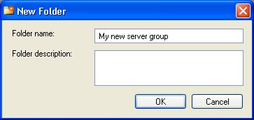Once you press the New Folder menu option, the New Folder dialog will show up and ask you to enter the folder name. When done, press the OK button to complete the folder creation. You can then drag server nodes and drop them on the new folder icon to move previously registered servers.